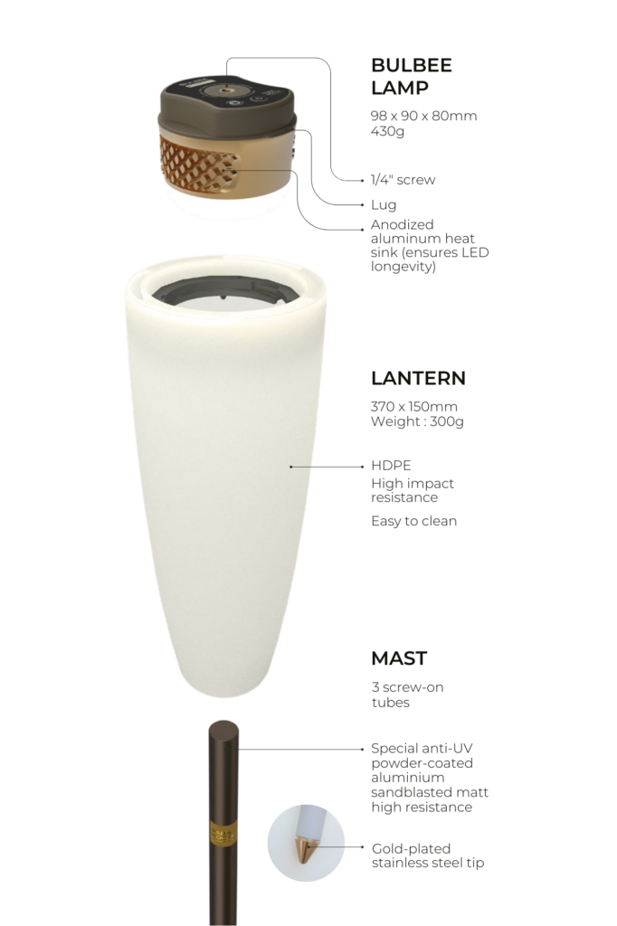 Locked into the lantern or used on its own, the compact Bulbee LED bulb is redefining outdoor lighting. Both powerful and comfortable, when suspended it can efficiently light up 30 m² for 9 hours.