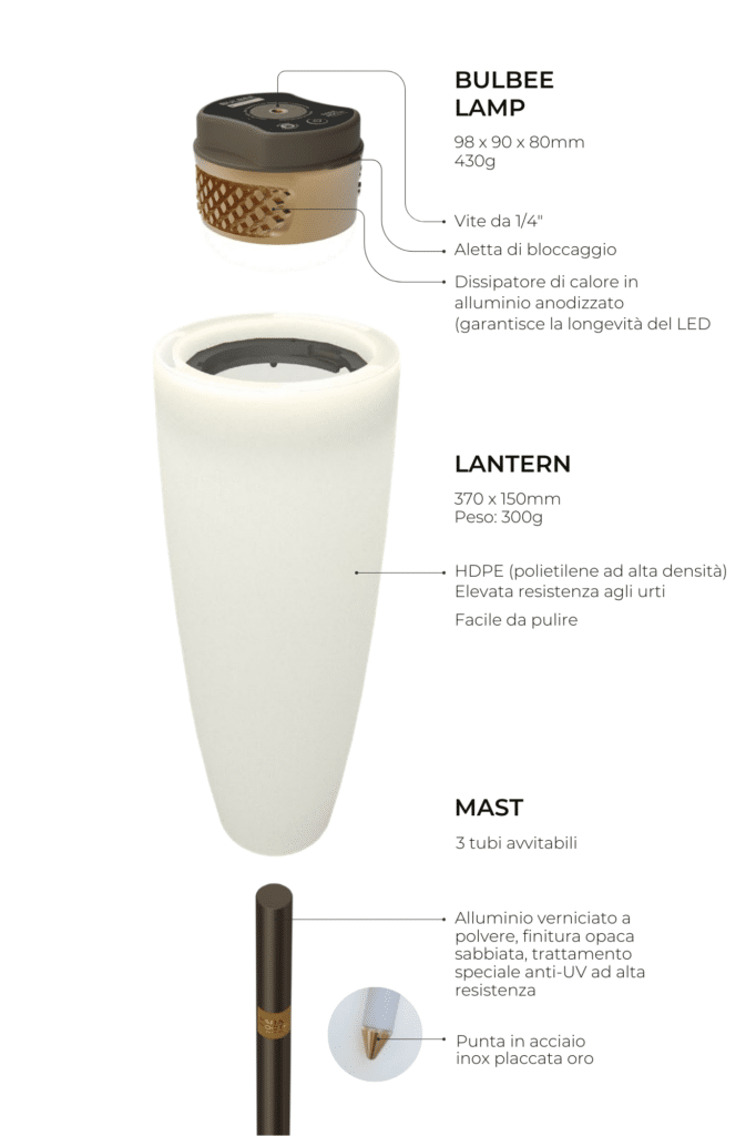 Bloccata nella lanterna o utilizzata da sola, la lampadina LED compatta Bulbee rivoluziona l’illuminazione outdoor. Potente e al tempo stesso confortevole, in versione sospesa permette di illuminare efficacemente 30 m² per 9 ore.